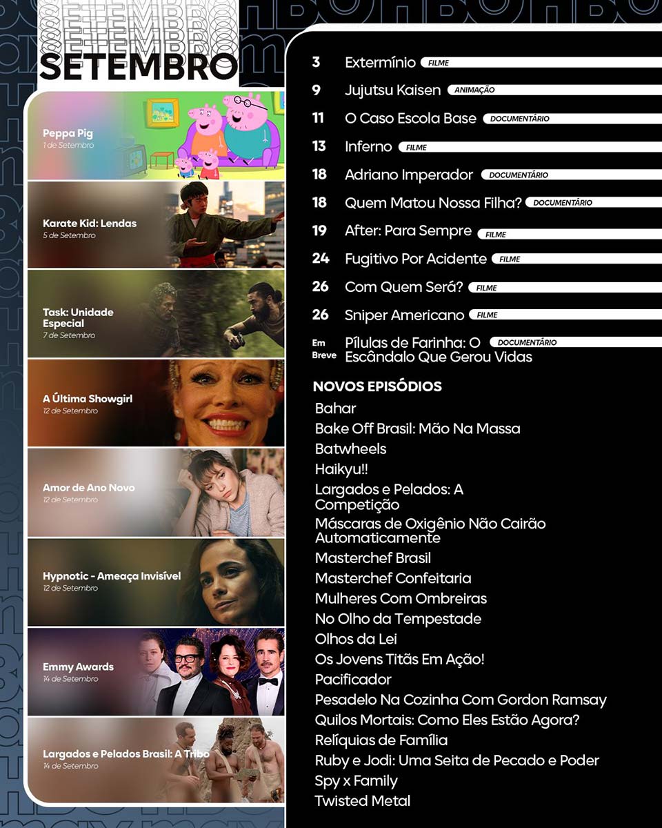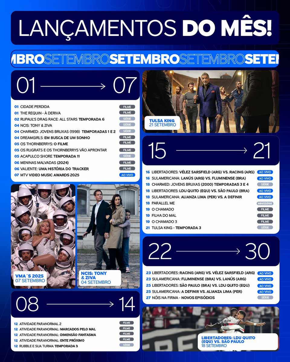 Setembro de 2025 promete ser um mês de peso para os principais serviços de streaming. As plataformas se preparam para estreias aguardadas e eventos ao vivo. Entre os destaques,a Paramount+ traz a terceira temporada de “Tulsa King”, estrelada por Sylvester Stallone, além da transmissão do MTV Video Music Awards 2025. A Disney+ aposta na nostalgia com a chegada do live-action “Lilo & Stitch”, enquanto a HBO Max terá a exibição do Emmy Awards e lança “Karate Kid: Lendas”.