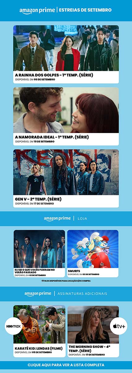 O Prime Video Brasil chega com a segunda temporada de “Gen V”. Já a Netflix traz a segunda parte da segunda temporada de “Wandinha” e novos episódios de “Casamento às Cegas Brasil”, duas de suas produções mais comentadas.