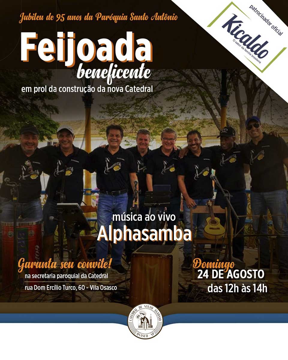 A Feijoada Beneficente da Catedral de Santo Antônio, em Osasco, que acontece no dia 24 de agosto já tem uma grande atração já confirmada: show com o grupo Alphasamba. O grupo formado por oito integrantes fará uma apresentação com hits de Samba para animar o domingo.