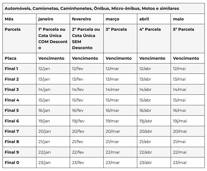 O pagamento segue o final da placa do veículo e pode ser feito à vista, com desconto de 3%, ou parcelado em até 5 vezes, de acordo com o valor do imposto devido.