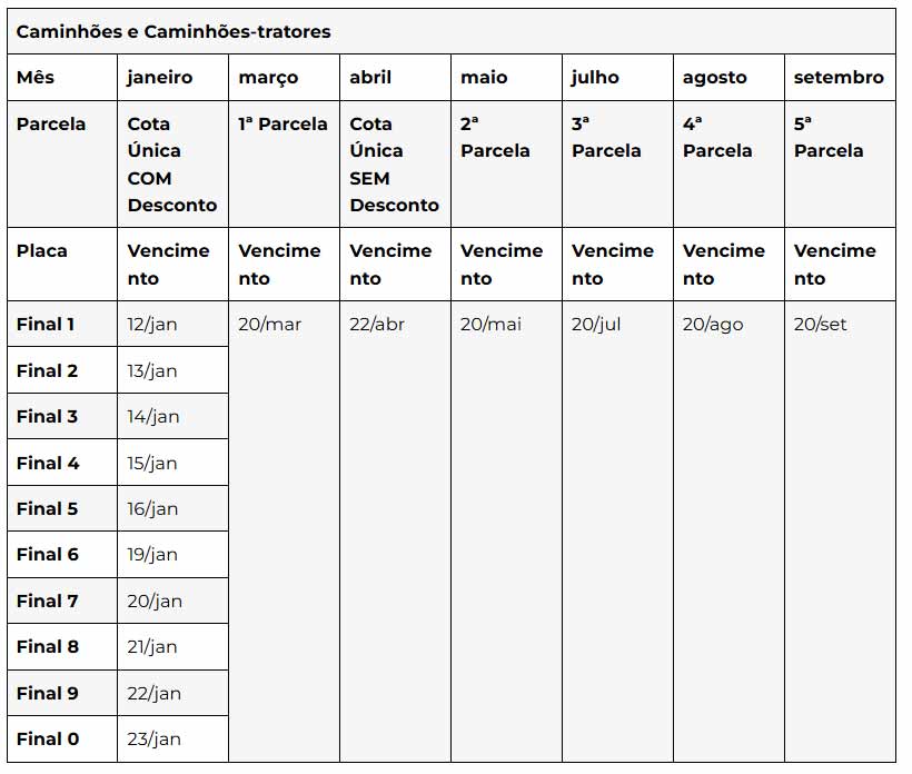 A tabela de pagamento para proprietários de veículos de carga é diferente. O pagamento pode ser feito, sem desconto, até 22 de abril, ou parcelado em até cinco vezes, com data fixada no dia 20 de cada mês.