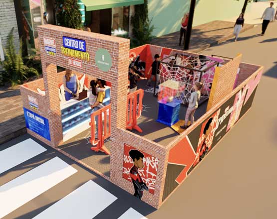 O Centro de Treinamento de Heróis reúne estações temáticas, com dinâmicas que estimulam raciocínio, coordenação motora e envolvimento dos pais. São três desafios: uma máquina de força baseada no Thor, uma “cama de gato” com teias de aranha dos personagens Miles e Gwen, e um jogo da memória com o tema do Capitão América.