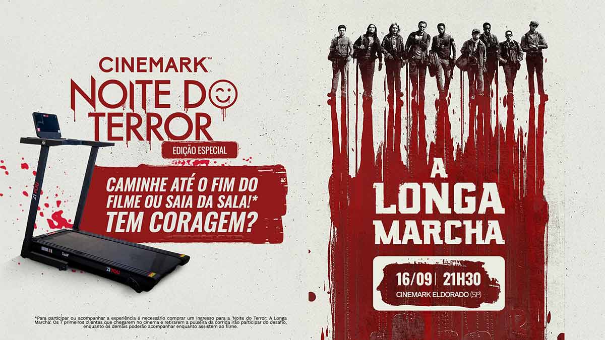 A Noite do Terror Cinemark terá uma edição especial com o filme ‘A Longa Marcha – Caminhe ou Morra’ no dia 16 de setembro, em São Paulo. A sessão única começará às 21h30, na Cinemark Eldorado, e a unidade terá ambientação especial do universo do longa. A venda de ingressos já está disponível no site e app da Rede. Membros Cinemark Club podem aproveitar o benefício do plano Black e resgatar seus ingressos para este evento.